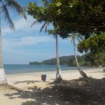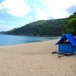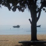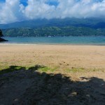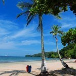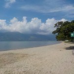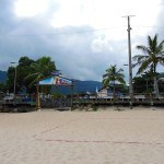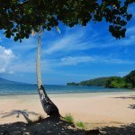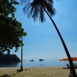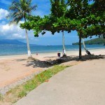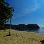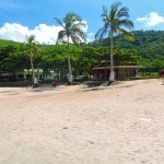 Praia de areia escura e batida. Pequenas palmeiras garantem sombra e servem de suporte para redes montadas por turistas.
