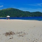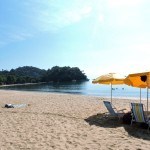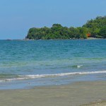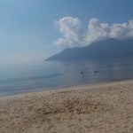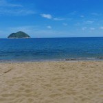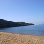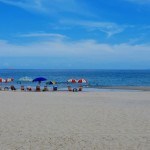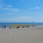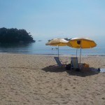 Mar com poucas ondas, areia grossa e solta, a orla é forrada de chapéus de Sol e coqueiros onde encontramos boas sombras.