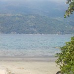 O mar é calmo e a faixa de areia escura plana e dura, boa para corrida e caminhada, do lado esquerdo se avista a ponta sul de Ilha de São Sebastião (Ilhabela).