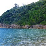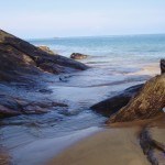 Na ponta da praia se percebe a água desaguando no mar, se estiver disposto a se aventurar é só seguir a fluente para chegar a queda d’agua.